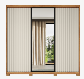 Porta com Espelho: Uma porta é revestida com um elegante espelho, emoldurada por acabamento em alumínio, que confere profundidade ao ambiente e praticidade no dia a dia.